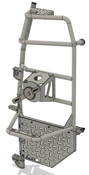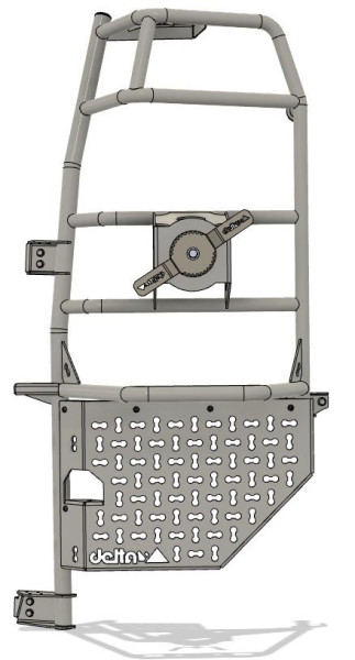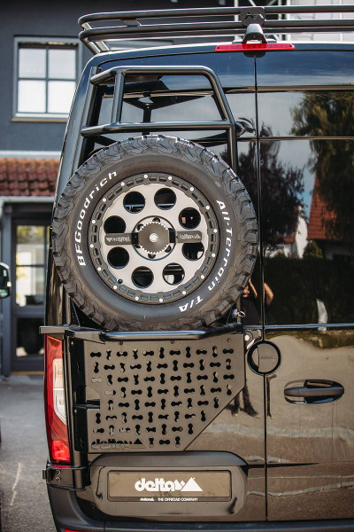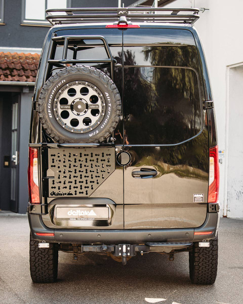 Der neue delta-Reserveradträger führt neben der Ersatzradträger-Funktion auch eine Leiterfunktion zusammen. Die sehr stabile Aluminium-Rohrkonstruktion trägt Räder bis 285/60R18. Die Befestigung erfolgt an den Scharnieren der Hecktür auf der Fahrerseite und über 2 Anschraubungen direkt an der Hecktür. Für hervorragenden Korrosionsschutz ist der Träger pulverbeschichtet.
